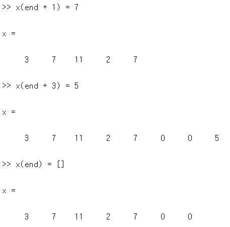 x(end + 1) = 7; -> end 자리에 +1 한 인덱스에 값을 할당. 즉, x(5)에 7할당 x = [3,7,11,2,7]