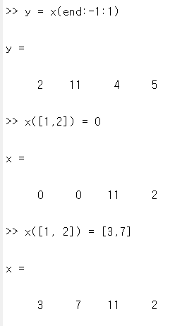y = x(end:-1:1); -> x(end), x 맨끝 인덱스에 접근! y = [2, 11, 4, 5]