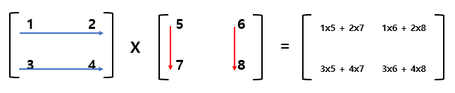 행렬 곱셈은 위와 같이 원소간 곱셈보다