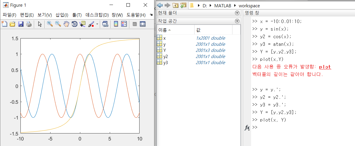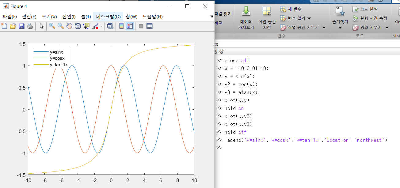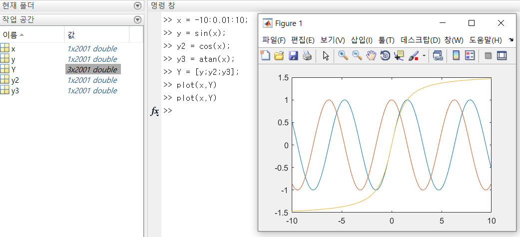 plot(x,y3) -> figure1 창에 y=tan-1(x) 그래프 생성