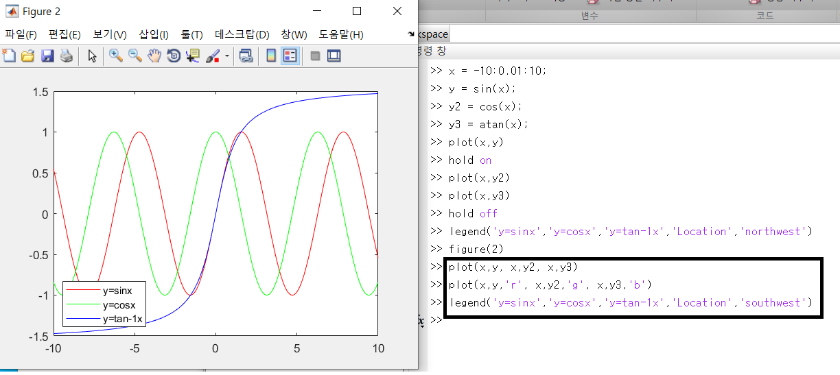 plot(x,y2) -> figure1 창에 y=cos(x)그래프 생성