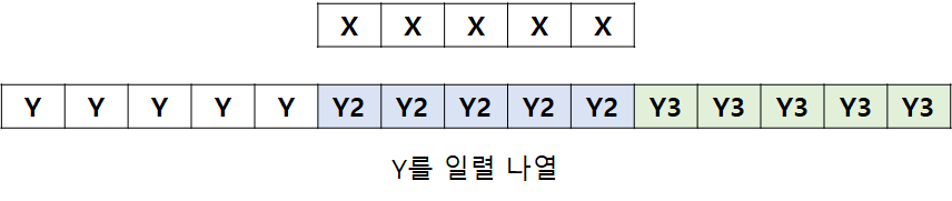 x:y 가 1:1 대응이 되지않기 때문에 행 또는 열벡터로 나열을 해주어야합니다!
