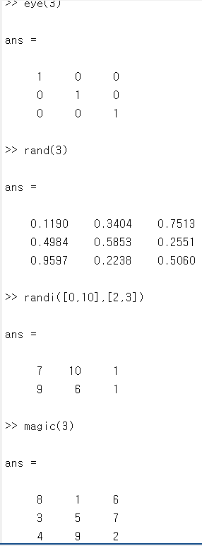 c = ones(m, n); -> 모든 성분이 1인 m x n 행렬D = eye(n); -> n x n 단위 행렬(identity matrix)