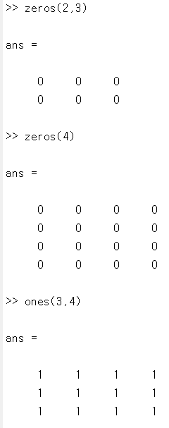 A = zeros(m, n); -> 모든 성분이 0인 m x n 행렬