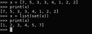 x = [7, 5, 3, 3, 4, 1, 2, 2] x = list(set(x))
