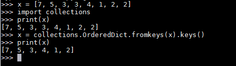 import collections x = [7, 5, 3, 3, 4, 1, 2, 2] x = collections.OrderedDict.fromkeys(x).keys()