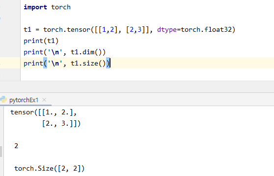 선언한 변수의 dimension과 size t1과 t1의 dimension, size 을 출력해보면 다음과 같이 나오네요!